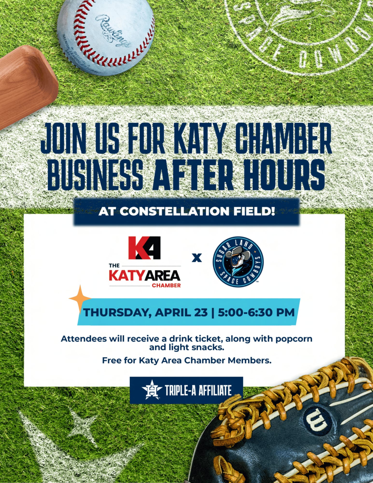 Join the Katy Area Chamber of Commerce for a special Business After Hours in a private Sugar Land Space Cowboys suite on April 23 from 5:00–6:30 PM.