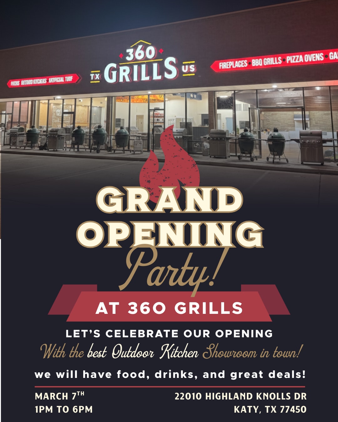Join us for the official Grand Opening of Outdoor Kitchen and Fireplaces on Saturday, March 7th from 11am to 6pm.