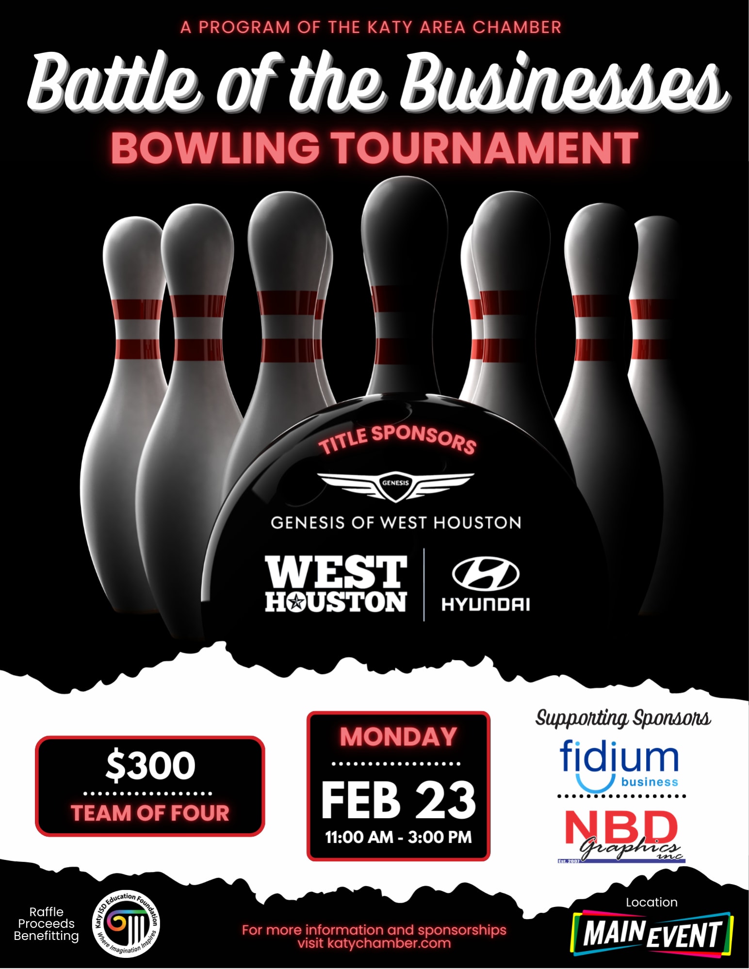 Get ready for friendly competition, team spirit, and community fun at the Battle of the Businesses Bowling Tournament! This annual event brings together Katy-area businesses for an exciting day of strikes, spares, networking — and a special raffle supporting the Katy ISD Education Foundation and their mission of funding teacher grants.