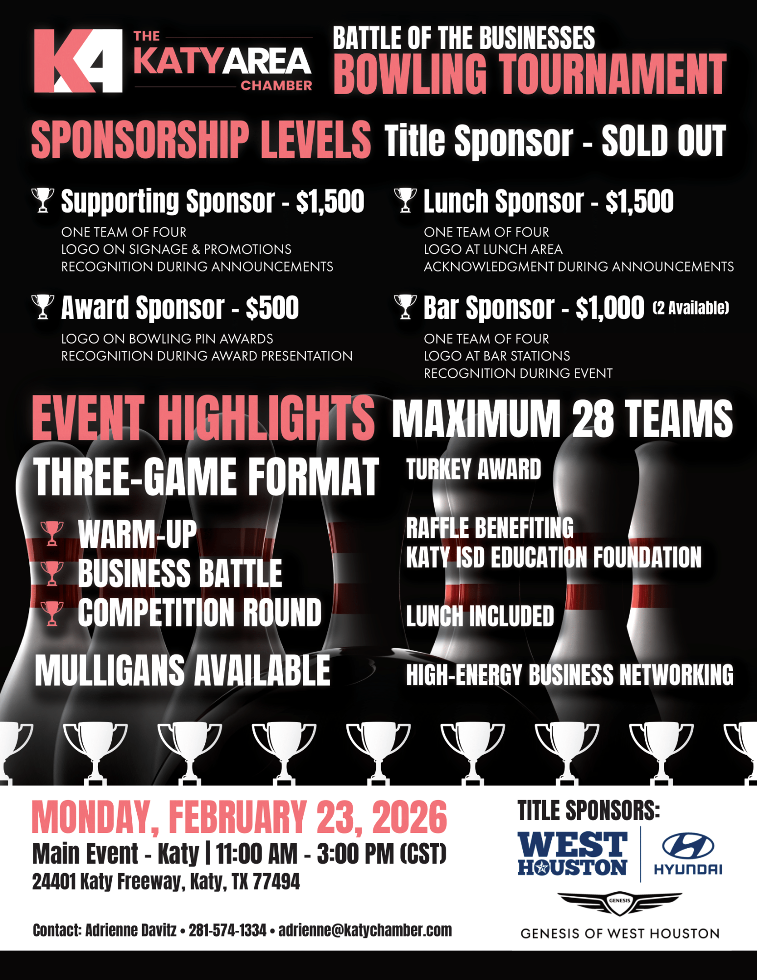 Get ready for friendly competition, team spirit, and community fun at the Battle of the Businesses Bowling Tournament! This annual event brings together Katy-area businesses for an exciting day of strikes, spares, networking — and a special raffle supporting the Katy ISD Education Foundation and their mission of funding teacher grants.