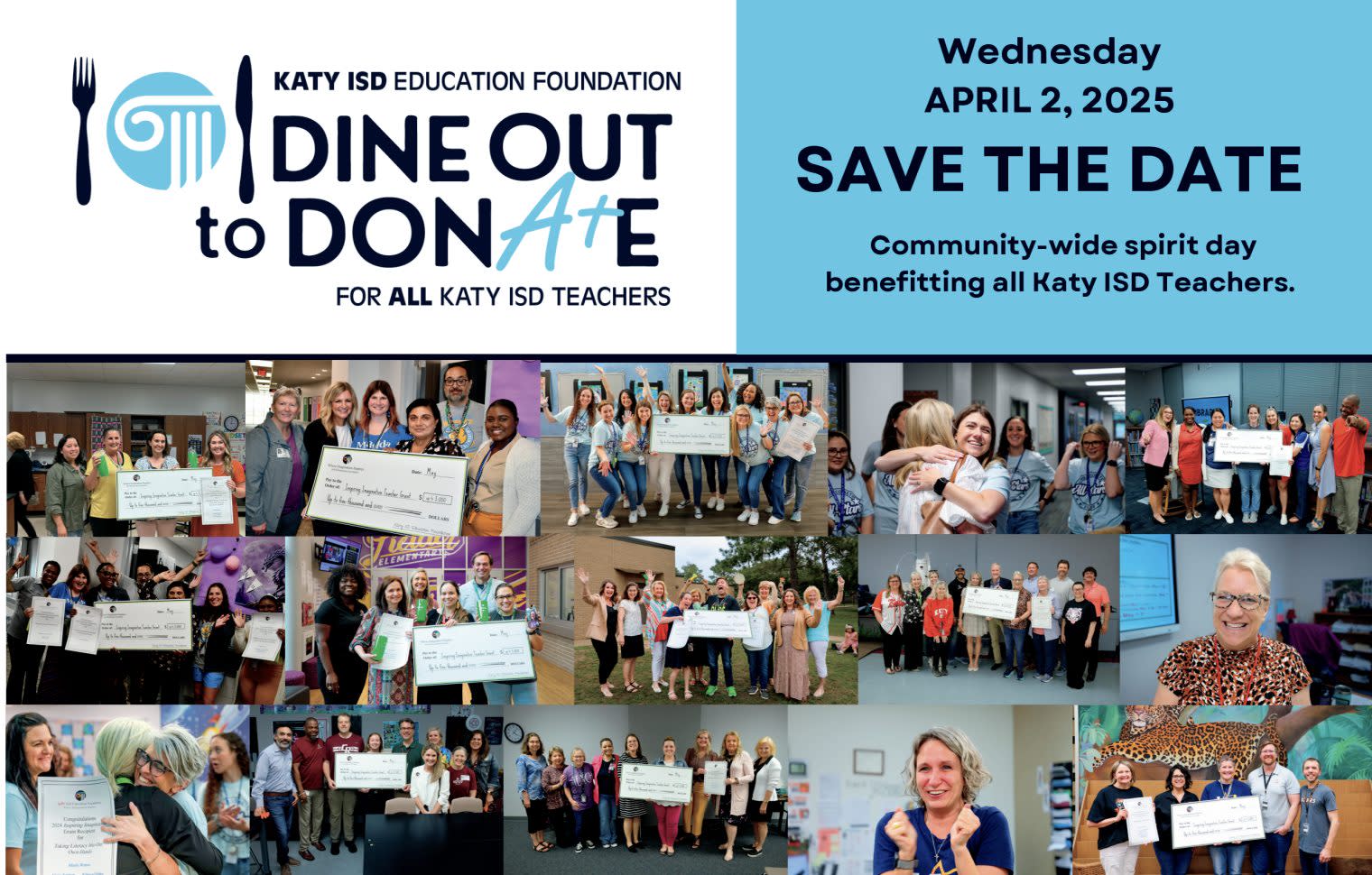 Community wide SPIRIT DAY!! Support our local restaurants AND our local teachers all in one day. Our Katy community will be showing up in droves for this yummy event, April 2nd! Make plans to go in-person or plan ahead with a to-go order! A portion of your meal’s proceeds go back to our Katy ISD teachers in the form of a teacher grants! 🩷