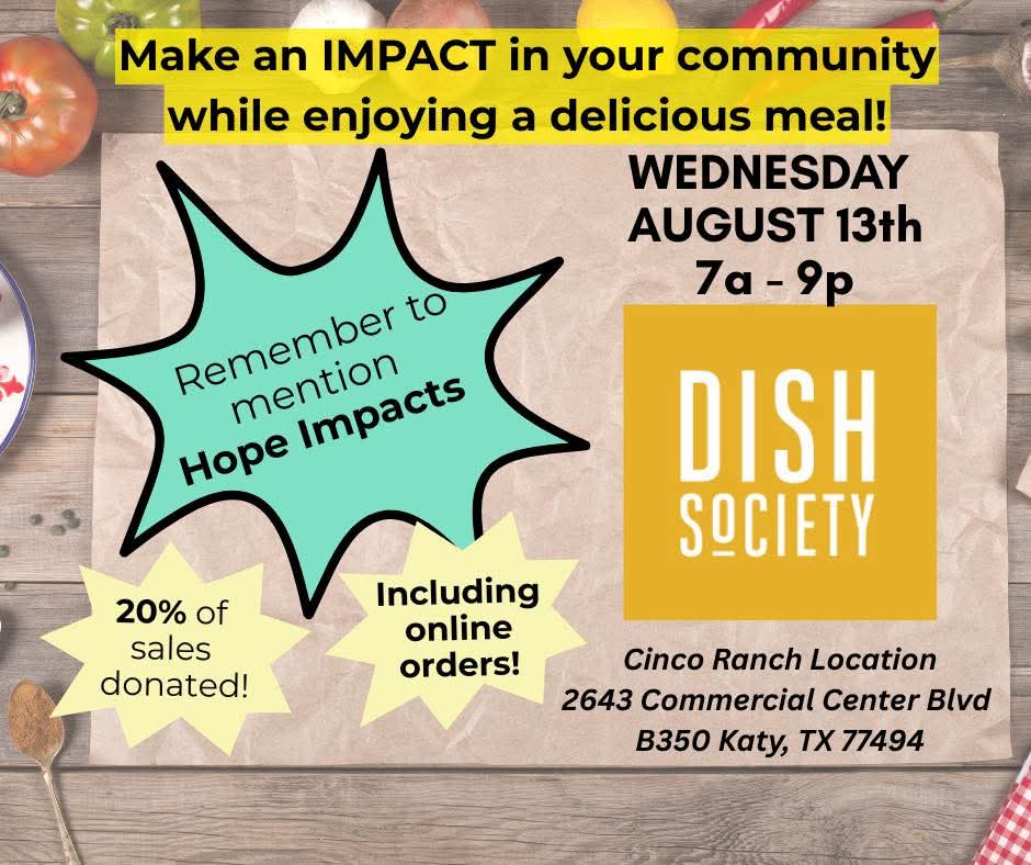 Make an IMPACT in your community while enjoying a delicious meal! WEDNESDAY AUGUST 13th 7a - 9p DISH SOCIETY Spirit Night for Hope Impacts! Remember to mention Hope Impacts. 20% of sales donated! Including online orders!