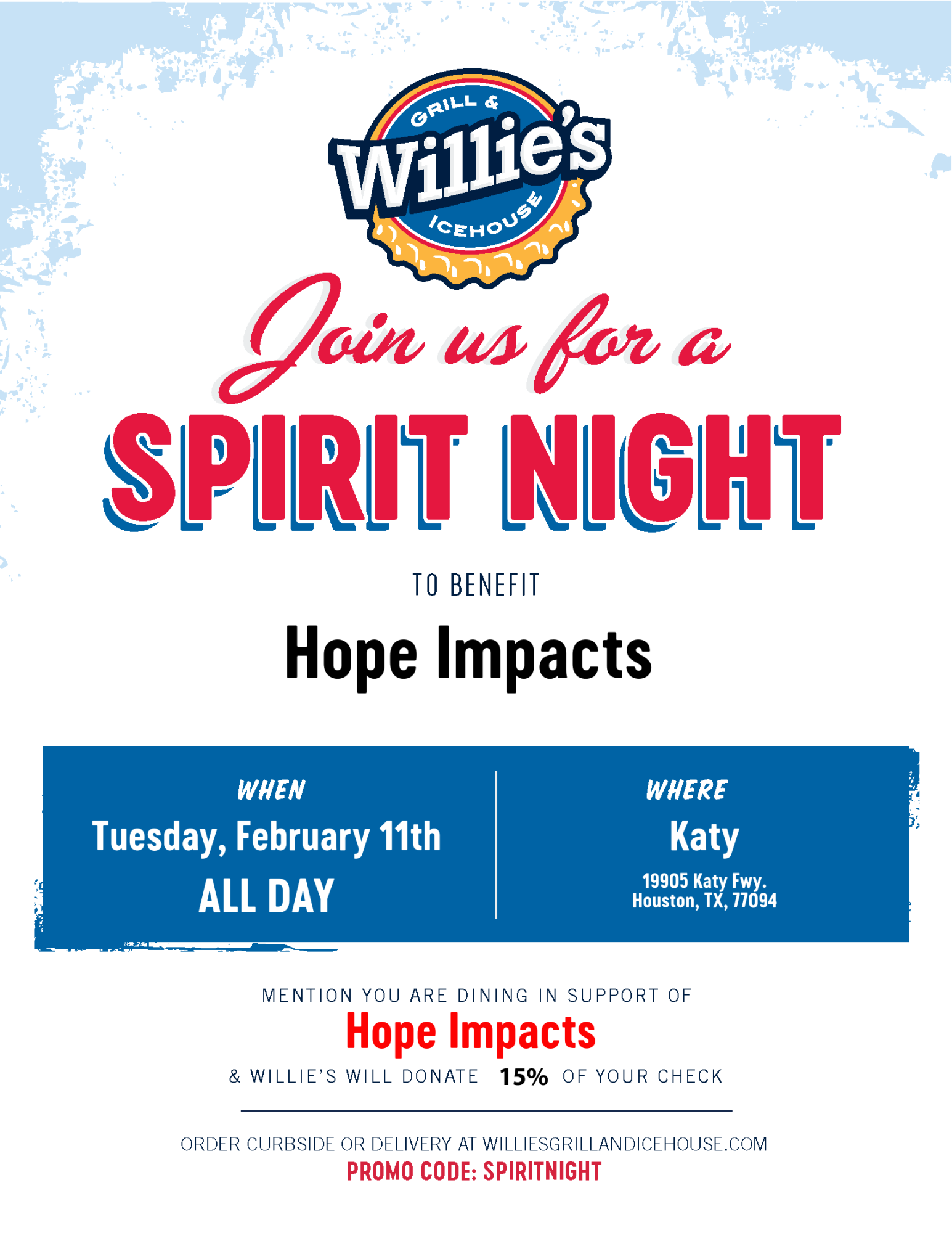 ALL DAY UNTIL CLOSE. Thank you so much for your support! MENTION YOU ARE DINING IN SUPPORT OF HOPE IMPACTS & WILLIE'S WILL DONATE 15% OF YOUR CHECK ORDER CURBSIDE OR DELIVERY AT WILLIESGRILLANDICEHOUSE.COM PROMO CODE: SPIRITNIGHT