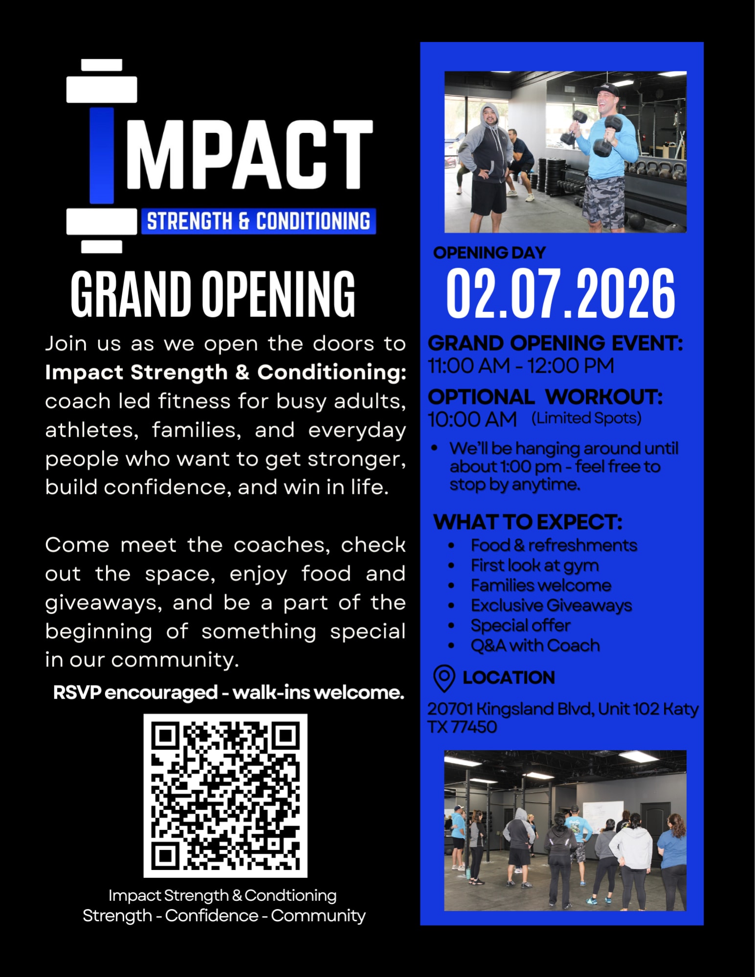 Join us as we open the doors to Impact Strength & Conditioning: coach led fitness for busy adults, athletes, families, and everyday people who want to get stronger, build confidence, and win in life.