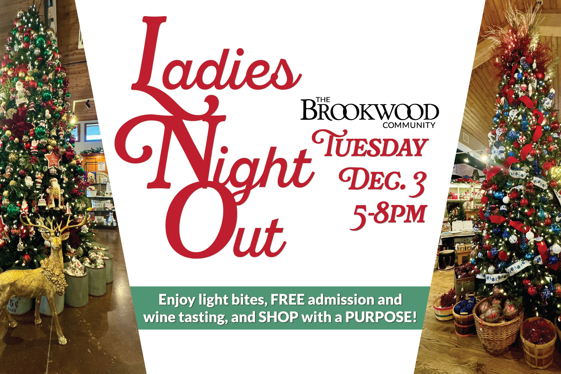 Join us on Tuesday, Dec. 3 from 5-8pm for a fabulous Ladies' Night Out at Brookwood! 💃 ✨ Sip on free wine (yes, please!) 🍷, enjoy light bites, and shop 'til you drop with a purpose at our Gift & Garden Center.