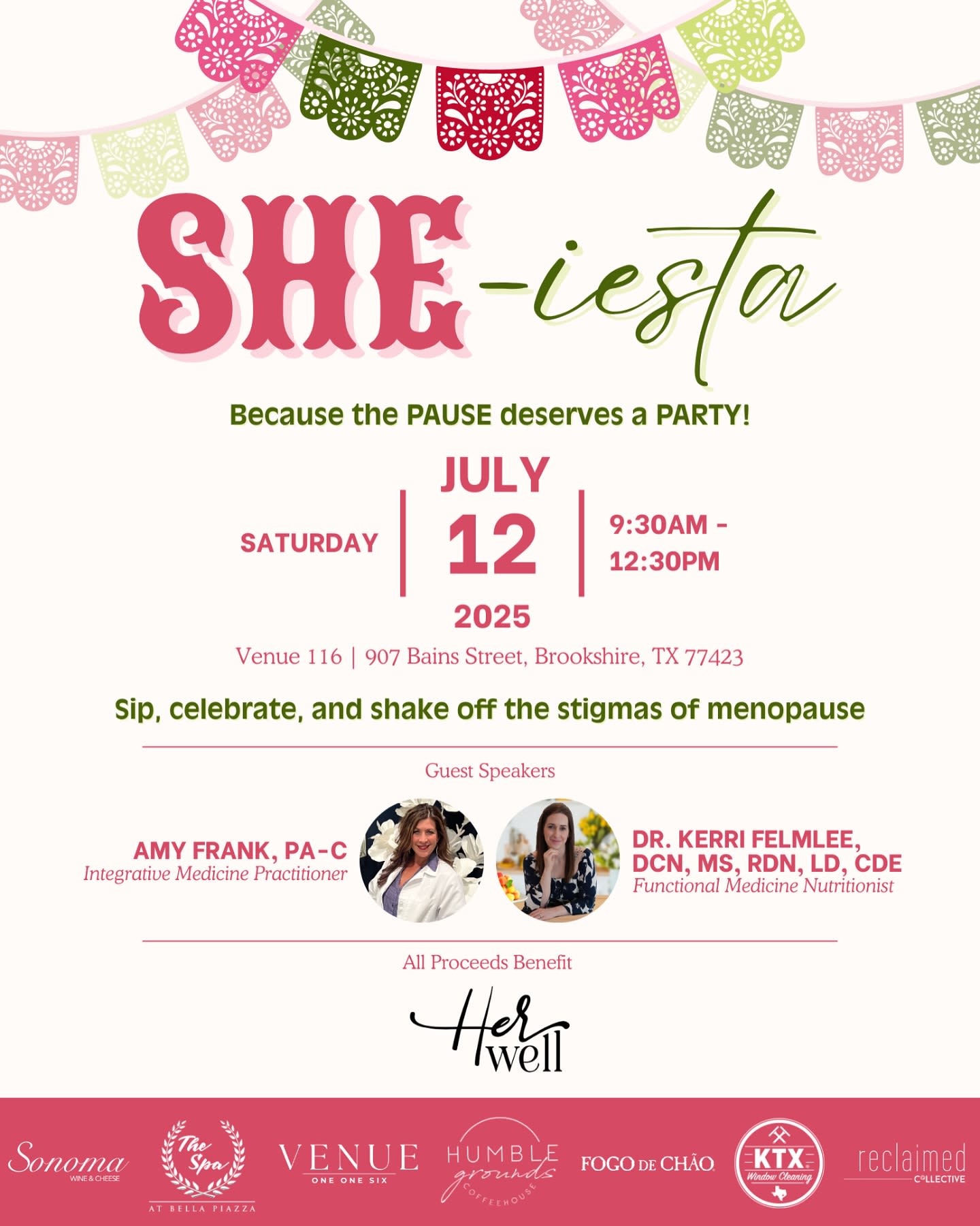 Because the PAUSE deserves a PARTY! 🥂💕 Join us for SHE-iesta — a vibrant, brunch-style event to sip, celebrate, and shake off the stigmas of menopause. Saturday, July 12 | 9:30AM–12:30PM Venue 116 | 907 Bains Street, Brookshire, TX Enjoy mimosas, community, and empowering conversations with guest speakers: Amy Frank, PA-C & Dr. Kerri Felmlee, DCN, MS, RDN, LD, CDE ✨ Let’s normalize the conversation and uplift each other in every season of womanhood 🌸 All proceeds benefit @herwell_ministry Inspired by @oprah Menopause Revolution segment, featuring @halleberry Grab your girls and let’s SHE-iesta!