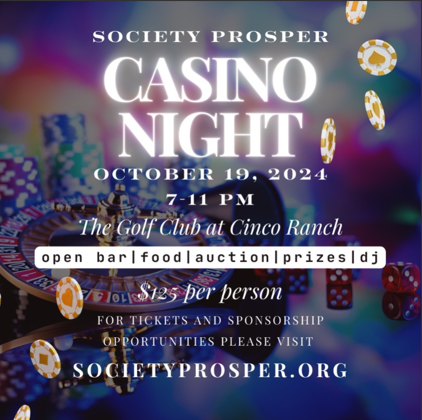 Join us for our 3rd annual Casino Night for Charity on October 19 from 7-11 pm at The Golf Club at Cinco Ranch. Society Prosper is a local children's charity whose mission is to break the cycle of child abuse by providing financial assistance for therapy and counseling services to children who suffered abuse and neglect. Your all-inclusive ticket covers access to the open bar, delicious food, casino games, slots, DJ, photobooth, live and silent auction, and more! Best of all, you'll be supporting our mission to help children overcome the trauma of abuse. Come out for a night of fun, entertainment, and giving back! Tickets are available for purchase: www.societyprosper.org/events Each ticket purchased helps children heal from abuse. Tickets must be purchased in advance and will not be available for purchase at the door.