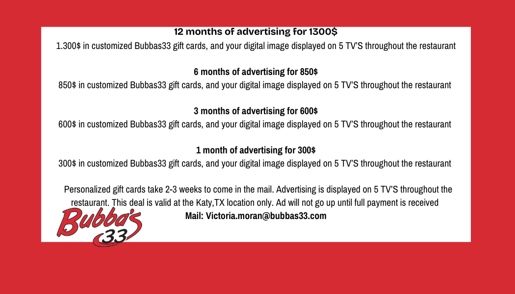 Here’s the best part: every dollar you invest in advertising comes right back to you in the form of personalized Bubba’s 33 gift cards featuring your logo. These branded cards make perfect employee incentives, client gifts, or community giveaways—so it’s a win-win for your business.